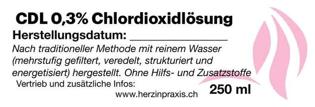 Chlordioxidlösung (0,3%) 3000 ppm nach traditioneller Methode mit reinem Wasser (mehrstufig gefiltert, veredelt, strukturiert und energetisiert) hergestellt. Ohne Hilfs- und Zusatzstoffe.